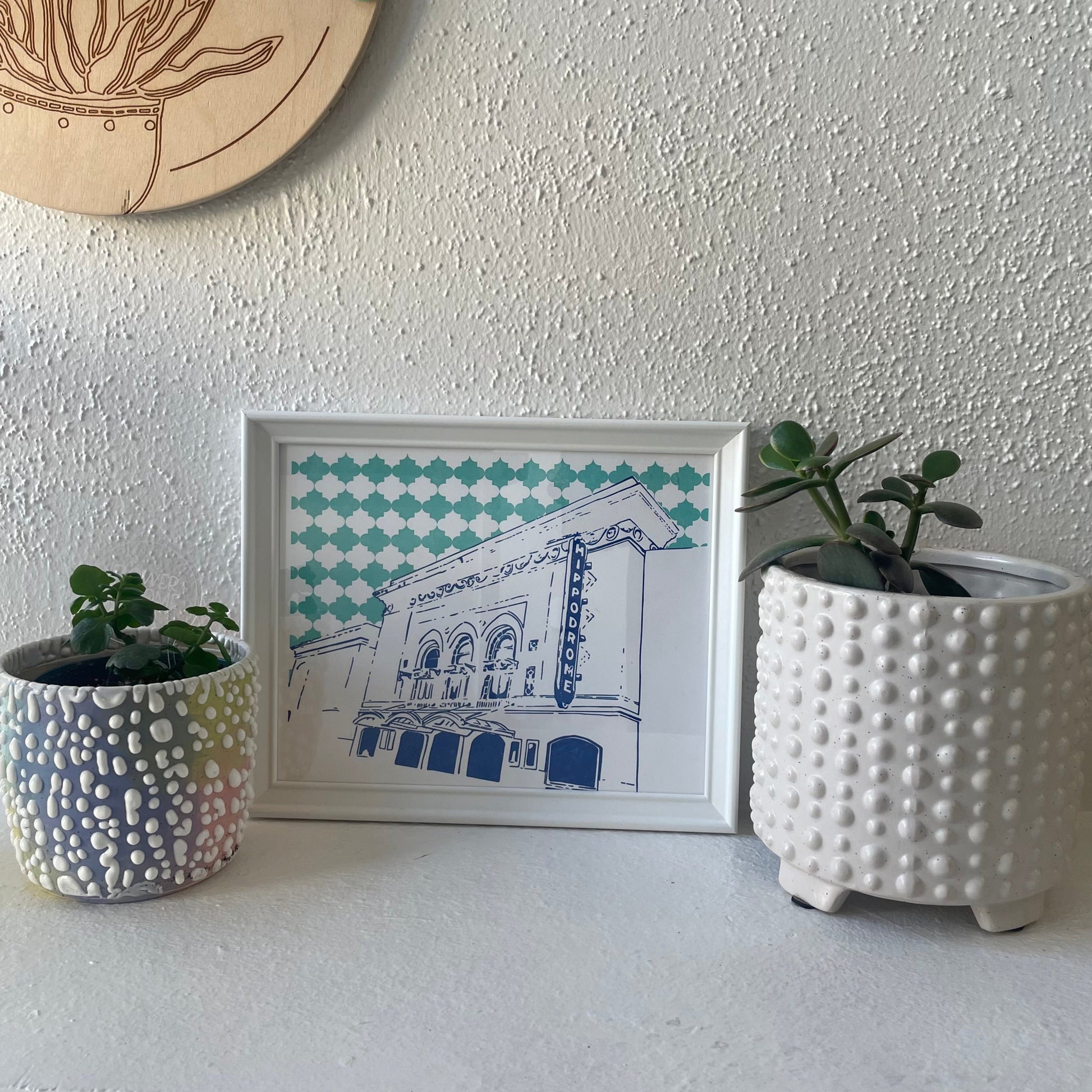 Baltimore is full of history, icons and stories. This 2 color letterpress poster illustrates Hippodrome in the Downtown neighborhood of Baltimore. There is a Moroccan tile pattern in the background.