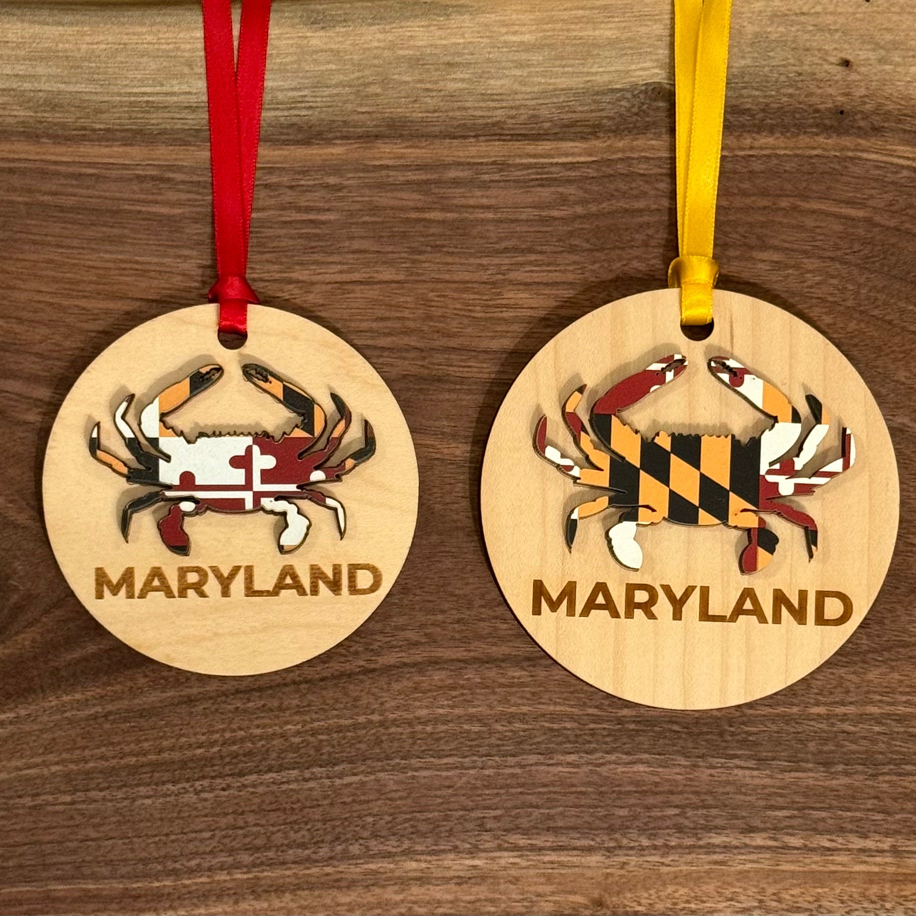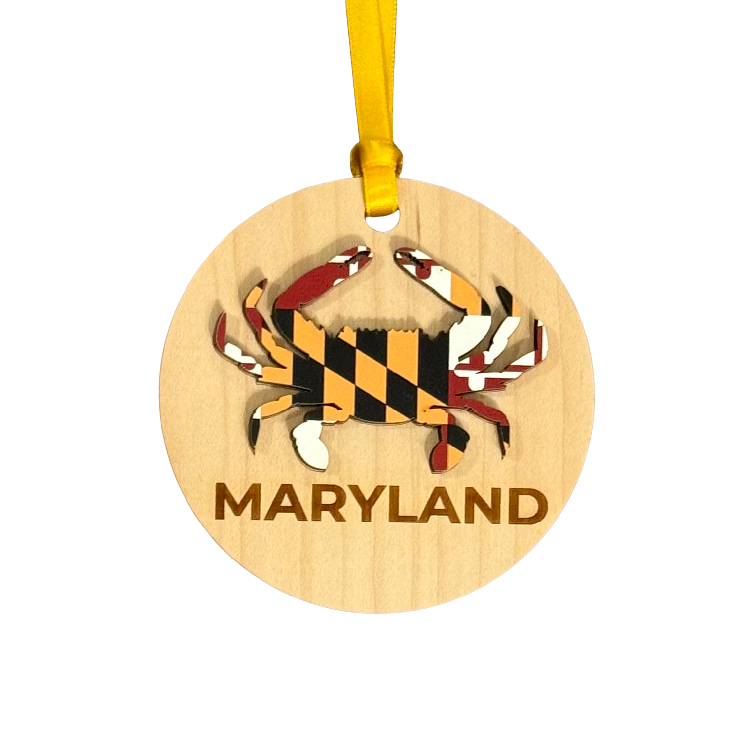 Celebrate your love for Maryland with our stunning Maryland Crab Ornament! This beautifully crafted wooden ornament features a laser-cut crab design from the iconic Maryland flag patterned MDF. A perfect addition to any tree, or to elevate your gift wrap game, this ornament is a must-have for anyone who calls Maryland home or their home away from home.