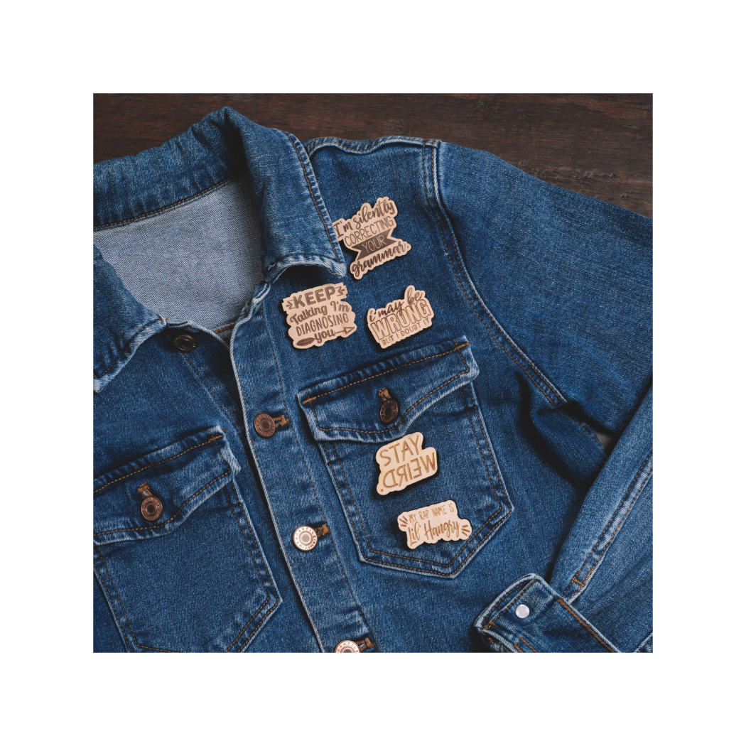 Unleash your inner rap star and warn others of your hangry state with the engraved wood pin. This quirky accessory is both a playful fashion statement and a helpful warning to potential food stealing friends. (Warning: may cause spontaneous rapping.)