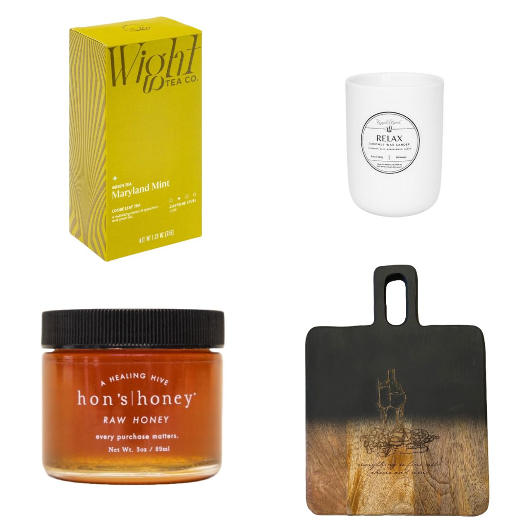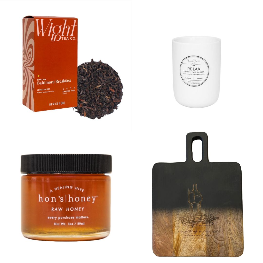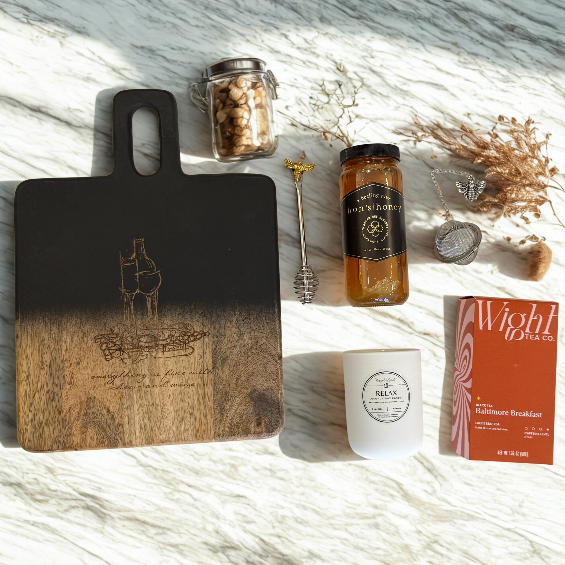 A tribute to life’s quiet, golden moments, this beautifully curated set is designed to bring comfort, connection, and calm. It features a soothing Keppel & Kismet Candle to set the mood, a comforting blend of Wight Tea Co. tea for slow sips, and a jar of Hon’s Honey: Raw Honey, harvested with care and intention. The set is completed with our Ombre Square Cheese Board, adding a refined touch to any gathering or daily ritual. Whether gifted as a warm welcome, a heartfelt “thank you,” or a moment of everyday luxury, this set invites the recipient to pause, savor, and feel deeply appreciated.