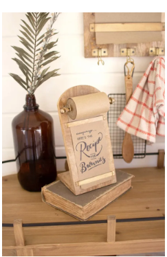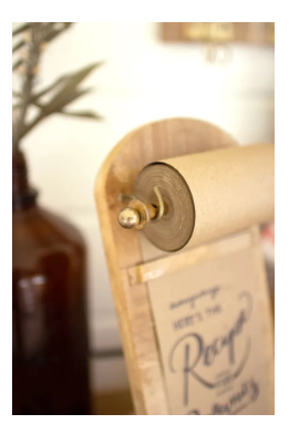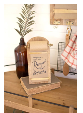 Leave thoughtful notes, jot down your schedule, grocery list, or family recipes, or let the kids doodle on this wooden note roll dispenser, featuring brass hardware. Comes with one roll of paper, but you can purchase replacements here.